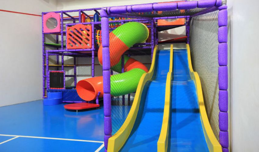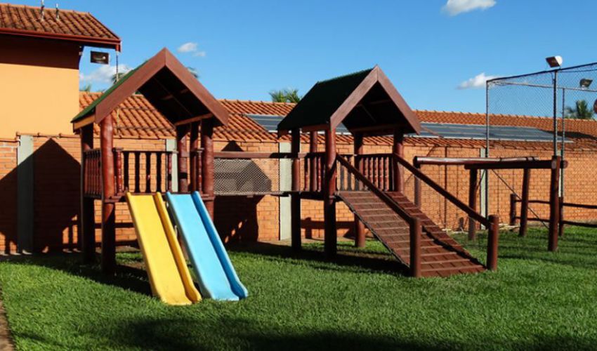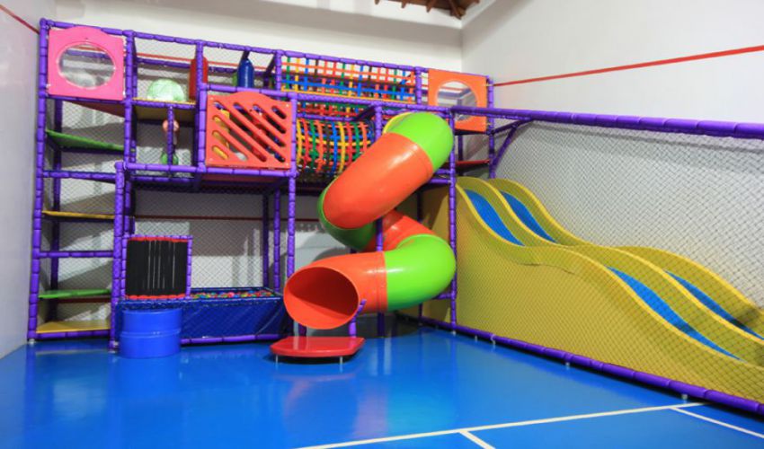 Lanchonete, playground com tanque de areia, casinha de brinquedo com mini banheiro, espaço kids com brinquedão trepa-trepa, escorregador, piscina de bolinha e espaço para os pais observarem seus filhos.